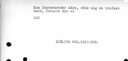 //// Kom fosterbroder käre, räck mig en trofast //// hand, förenta äro vi //// 100 //// ^ SÖDLING MUS.HIST.MUS. ////