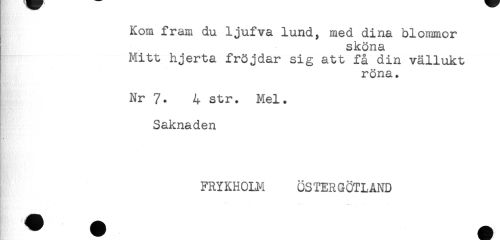 //// Kom fram du ljufva lund, med dina blommor //// sköna //// Mitt hjerta fröjdar sig att få din vällukt //// röna. //// Nr 7. 4 str. Mel. //// Saknaden //// FRYKHOLM ÖSTERGÖTLAND ////
