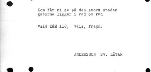 //// Kom får ni se på den stora staden //// gatorna ligger i rad om rad //// Vsld iÉÉ 116, Vals, fragm. //// ANDERSSON SV. LÅTAR ////