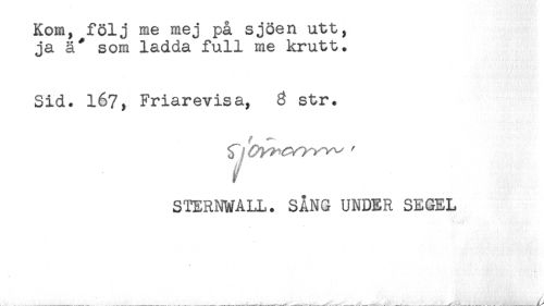 //// Kom, följ me mej på sjöen utt, //// ja ä* som ladda full me krutt. //// Sid. 167, Friarevisa, 8 str. //// / //// STERNWALL. SÅNG UNDER SEGEL ////