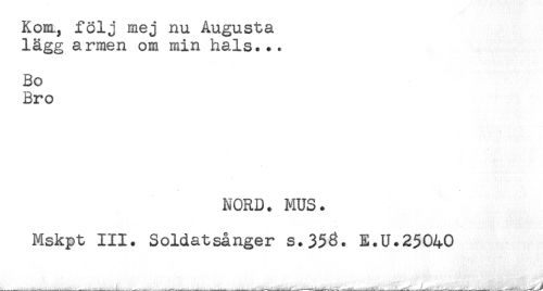 //// Kom,, följ mej nu Augusta //// lägg armen om min hals... //// Bo //// Bro //// NORD. MUS. //// Mskpt III. Soldatsånger s.353. E.U.25040 ////