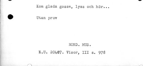 //// Kom glada gosse, lyss och hör... //// ! //// Utan prov //// t //// / //// NORD. MUS. //// E.U. 20407. Visor, III s. 973 //// r........ ////