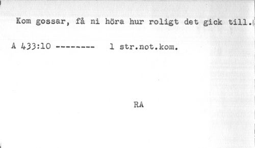 //// Kom gossar, få ni höra hur roligt det gick till. //// L //// A 433:10 -------- 1 str.not.kom. //// i //// j //// RÅ ' //// < //// ! ////
