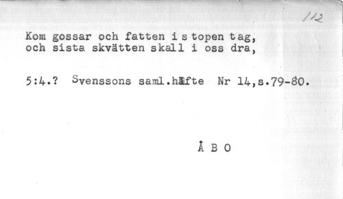 //// Kom gossar och fatten i stopen tag, //// och sista skvätten skall i oss dra, //// i //// 5:4*? Svenssons saml.håfte Nr 14,s.79-30. //// i //// ÅBO ////