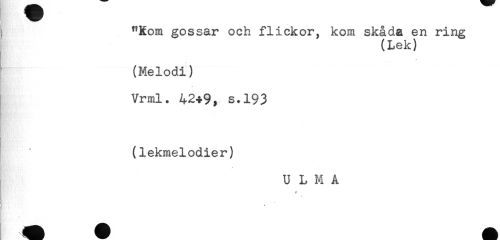 //// "Kom gossar och flickor, kom skåda en ring //// (Lek) //// (Melodi) //// Vrml. 4249, s.193 //// (lekmelodier) //// U L M A ////
