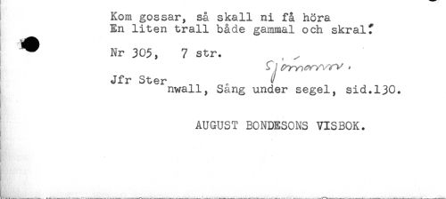 //// Kom gossar, så skall ni få höra //// En liten trall både gammal och skralt //// ^ Nr 305, 7 Str. ^ ^ //// Jfr Ster , ^ //// nwall, Sang under segel, sid.130. //// AUGUST BONDESONS VISBOK. ////