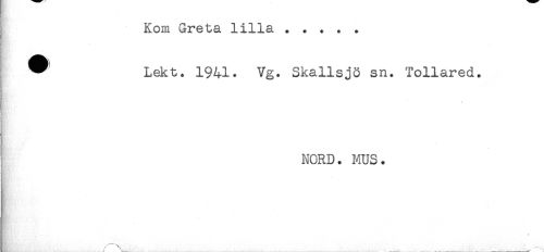 //// Kom Greta lilla ..... //// ^ Lekt. 1941. Vg. Skallsjö sn. Tollared. //// * //// NORD. MUS. ////
