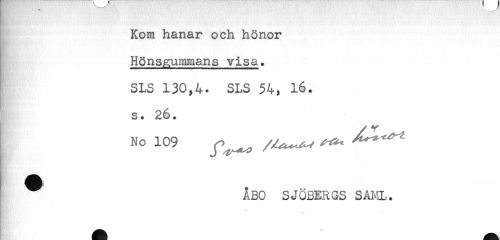 //// Kom hanar och hönor //// Hönsgummans visa. //// SLS 130,4. SLS 54, 16. //// s. 26. //// No 109 ^ //// ÅBO SJÖBERGS SAML. //// K;.'' ////