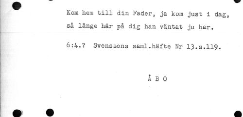//// Kom hem till din Fader, ja kom just i dag, //// så länge här på dig han väntat ju har. //// 6:4.? Svenssons saml.häfte Nr 13.s.119. //// ÅBO ////