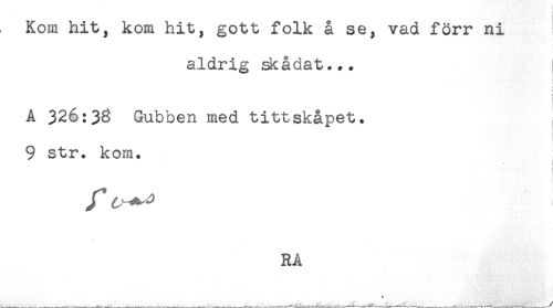 //// . Kom hit, kom hit, gott folk å se, vad förr ni //// aldrig skådat... //// ? //// ! //// < //// A 326:38 Gubben med titt skåpet. //// 9 str. kom. //// RA ////