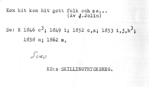 //// Kom hit kom hit gott folk och se... //// (Av J.Jolin) //// * //// ? //// Se: E 1346 c3; 1349 i; 1352 c,s; 1853 //// 1858 n; 1862 m, //// KB:s SKILLINGTRYCKSREG. ////