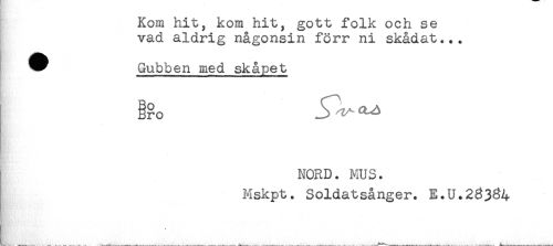 //// Kom hit, kom hit, gott folk och se //// vad aldrig någonsin förr ni skådat... //// ^ Gubben med skåpet //// H' //// i //// NORD. MUS. //// Mskpt. Soldatsånger. E.U.28384 //// __ ////
