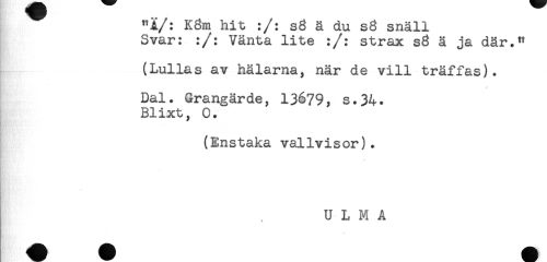 //// "i/: K8m hit :/: s3 ä du s8 snäll //// Svar: :/: Vänta lite :/: strax s8 ä ja där." //// (Lullas av hälarna, när de vill träffas). //// Dal. Grangärde, 13679, s.34. //// Blixt, 0. //// (Enstaka vallvisor). //// * //// i //// . //// U L M A ////