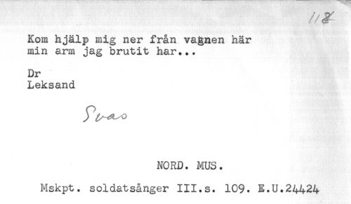 //// // //// Kom hjälp mig ner från vagnen här //// min arm jag brutit har... //// Dr //// Leksand //// NORD. MUS. //// Mskpt. soldatsånger III.s. 109. E.U.24424 ////