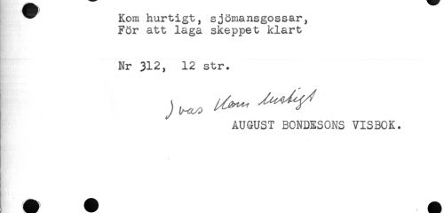 //// ^ Kom hurtigt, sjömansgossar, //// För att laga skeppet klart //// Nr 312, 12 str. //// AUGUST BONDESONS VISBOK. //// t H ////