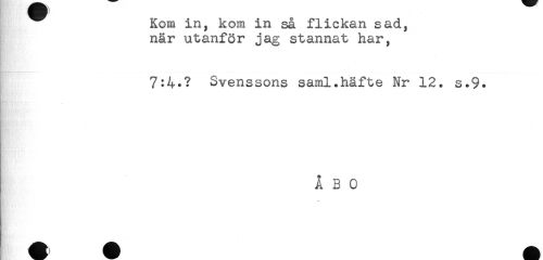 //// Kom in, kom in så flickan sad, //// när utanför jag stannat har, //// E: ' //// 7:4.? Svenssons saml.häfte Nr 12. s.9. //// K""- //// - //// ÅBO ////