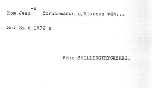 //// -s //// Kom Jesu förbarmande själarnas vän... //// Se: Zz d 1672 a //// KB:s SKILLINGTRYCKSREG. ////
