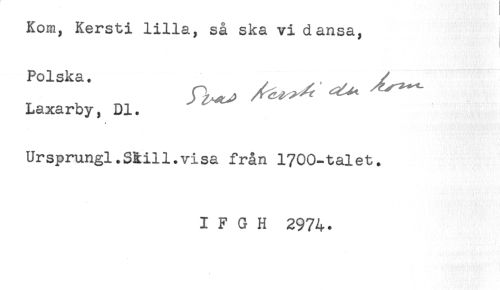 //// Kom, Kersti lilla, så ska vi dansa, //// Polska. , , / //// Laxarby, Dl. //// Ursprungl.Skill.visa från 1700-talet. //// I F G H 2974. ////