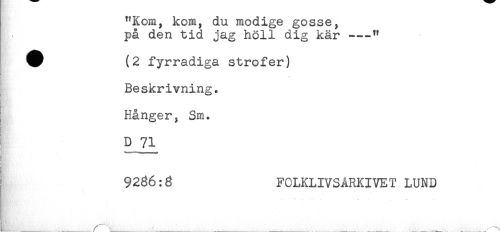 //// "Kom, kom, du modige gosse, //// på den tid jag höll dig kär —" //// ^ (2 fyrradiga strofer) //// Beskrivning. //// Hånger, Sm. //// D 71 //// 9286:3 FOLKLIVSARKIVET LUND ////