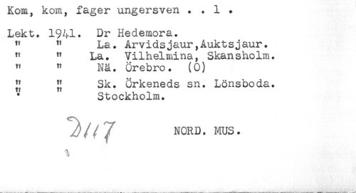 //// iWJiii , iY^iii , JL A LAii&^A V ^ii * * -t- * //// Lekt. 1941. Dr Hedemora. //// " " La. Arvidsjaur,Auktsjaur. //// " " La. Vilhelmina, Skansholm. //// " " Nä. Örebro. (0) //// jj {{ Sk. örkeneds sn. Lönsboda. //// Stockholm. //// NORD. MUS. ////