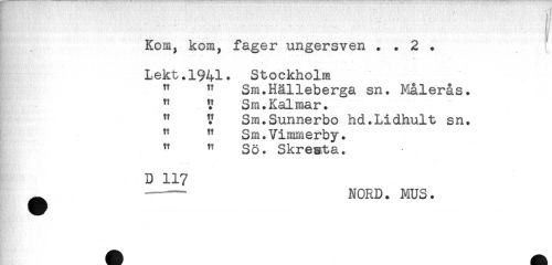 //// ' //// Kom, kom, fager ungersven . . 2 . //// Lekt.1941. Stockholm //// " " Sm.Hälleberga sn. Målerås. //// " V Sm.Kalmar. //// " ? Sm.Sunnerbo hd.Lidhult sn. //// " " Sm.Vimmerby. //// " " Sö. Skrewta. //// D 117 //// ^ ------NORD. MUS. ////