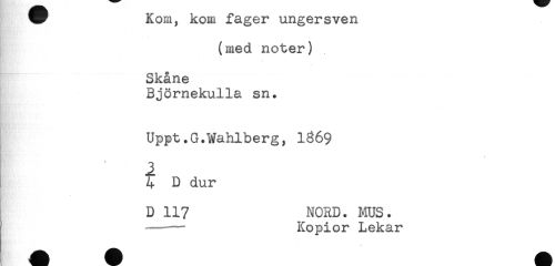 //// W Kom, kom fager ungersven //// (med noter) . //// Skåne //// Björnekulla sn. //// Uppt.G.Wahlberg, 1869 //// HHHHKifK' * //// i //// 4 D dur //// D 117 NORD. MUS. //// ' --------Kopior Lekar ////