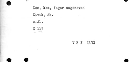 //// Kom, kom, fager ungersven //// Kivik, Sk. //// s.21. //// D 117 //// V F F 2432 ////