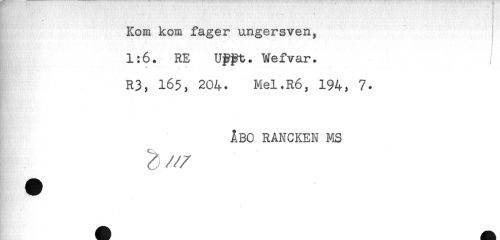 //// Kom kom fager ungersven, //// 1:6. RE Uppt. Wefvar. //// * < //// R3, 165, 204. Mel.R6, 194, 7. //// ÅBO RANCKEN MS //// ^ /// ////