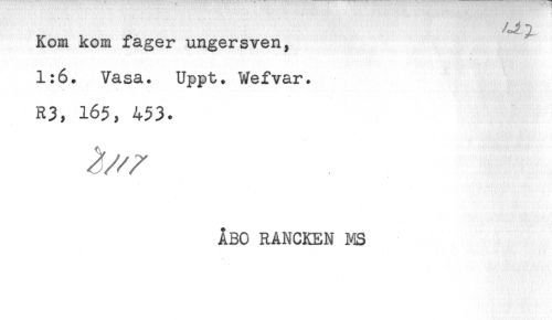 //// Kom kom fager ungersven, //// 1:6. Vasa. Uppt. Wefvar. //// R3, 165, 453. //// ABO RANCKEN MS ////