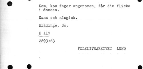 //// ^ Kom, kom fager ungersven, får din flicka //// i dansen. //// Dans och sånglek. //// Blädinge, Sm. //// D 117 //// 2893:63 //// FOLKLIVSARKIVET LUND //// * //// << , ////