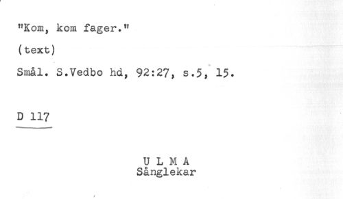 //// "Kom, kom fager." //// (text) //// Smål. S.Vedbo hd, 92:27, s.5, 15. //// D 117 ////