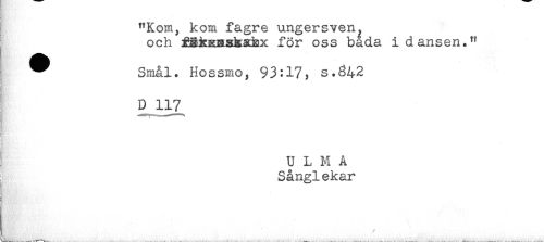 //// I "Kom, kom fagre ungersven^ //// och fäkgRgkxkx för oss bada i dansen." //// ^ Smal. Hossmo, 93:17, s.^42 //// D 117 //// § //// t //// U L M A //// Sånglekar ////