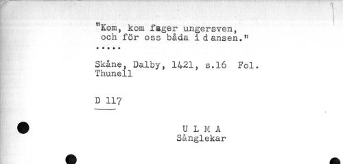 //// t //// å Kom, kom fager ungersven, //// och för oss båda i dansen." //// . ... * //// * + + * $ //// ** * * //// Skåne, Dalby, 1421, s.16 Fol. //// Thunell //// D 117 ////