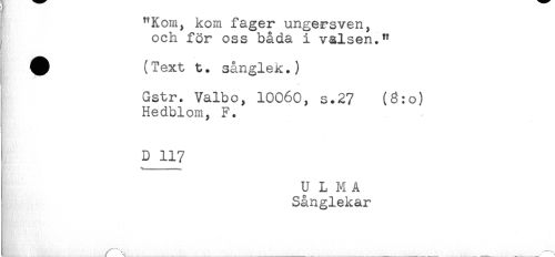 //// "Kom, kom fager ungersven, //// och för oss båda i valsen." //// ^ (Text t. sånglek.) //// KF //// V //// Gstr. Valbo, 10060, s.27 //// Hedblom, F. //// < //// . //// D 117 ////
