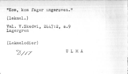 //// "Kom, kom fager ungersven." //// ! //// < //// (lekmel.) //// '. '* '.'.i; . it; :-.'<' //// Vml. V.Skedvi, 2447:2, s.9 , //// Lagergren //// < //// (Lekmelodier) //// U L M A ^ //// ) //// S ////