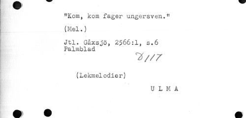 //// "Kom, kom fager ungersven." //// (Mel.) //// .t //// Jtl. Gåxsjö, 2566:1, s.6 //// Palmblad //// (Lekmelodier) //// ! « //// U L M A //// - ////