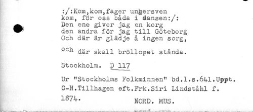 //// :/:Kom,kom,fager ungersven //// kom, för oss båda i dansen:/: //// ^ Den ene giver jag en korg //// * den andra för jag till Göteborg //// Och där är glädje å ingen sorg, //// och där skall bröllopet stånda. //// Stockholm. D 117 //// Ur "Stockholms Folkminnen" bd.l.s.641.Uppt. //// C-H.Tillhagen eft.Frk.Siri Lindståhl f. ////