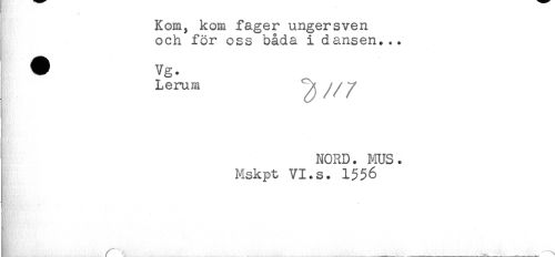 //// ^ Kom, kom fager ungersven //// och för oss båda i dansen... //// Lerum ^ /Z/' //// NORD. MUS. //// Mskpt VI.s. 1556 //// < //// ____,_ ////