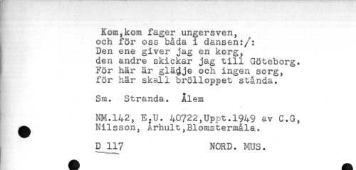 //// - * - . . ... . ^ //// R - ' ^ ..... //// Kom,kom fager ungersven, //// och för oss båda i dansen:/: //// ! Den ene giver jag en korg, //// den andre skickar jag till Göteborg. //// ; För här är glädje och ingen sorg, //// för här skall brölloppet stånda. //// Sm. Stranda. Ålem //// <-* ** — — -- //// NM.142, E.U. 40722,Uppt.1949 av C.G, //// Nilsson, Ärhult,Blomstermåla. //// D 117 NORD. MUS. ////