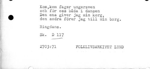 //// Kom,kom fager ungersven //// och för oss båda i dansen //// j ^ Den ena giver jag min korg, //// V den andra förer jag till min borg. //// Ringdans. //// Sk. D 117 //// 2703:71 FOLKLIVSARKIVET LUND //// \ //// ----- //// , ////