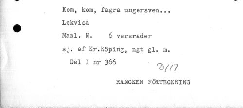 //// Kom, kom, fagra ungersven... //// Lekvisa //// Maal. N. 6 versrader //// j //// sj. af Kr.Köping, ngt gl. m. //// Del I nr 366 ^ //// ! RANCKEN FÖRTECKNING ////