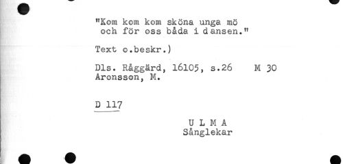 //// "Kom kom kom sköna unga mö //// och för oss båda i dansen." //// Text o.beskr.) //// Dis. Råggärd, 16105, s.26 M 30 //// I Aronsson, M. //// D 117 //// U L M A //// Sånglekar ////