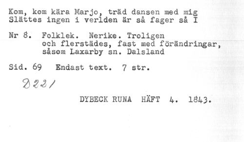 //// Kom, kom kära Marjo, träd dansen med mig //// Slättes ingen i verlden är så fager så I //// Nr Folklek. Nerike. Troligen //// och flerstädes, fast med förändringar, //// såsom Laxarby sn. Dalsland //// Sid. 69 Endast text. 7 str. //// DYBECK RUNA HAFT 4. 1643. ////