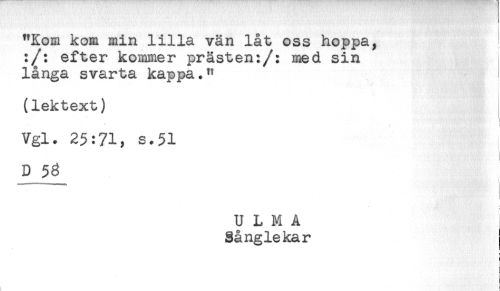 //// "Kom kom min lilla vän låt oss hoppa, //// :/: efter kommer prästen:/: med sin //// långa svarta kappa." //// (lektext) //// Vgl. 25:71, s.51 //// D 53 //// U L M A . //// Sånglekar j //// < ////