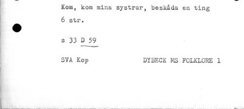 //// a.om, Kom mina systrar, t)e skada en ting //// I 6 str. //// s 33 D 59^ //// ' SVA Kop DYBECK MS FOLKLORE 1 ////