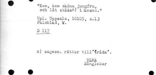 //// ^ "Kom, kom sköna jungfru, //// och låt skådax) 1 dansen." //// Upl. Uppsala, 10105, s.13 //// Palmblad, W. //// D 117 //// * //// x) sagesm. rättar tillträda*. //// ULMÅ //// Sånglekar ////