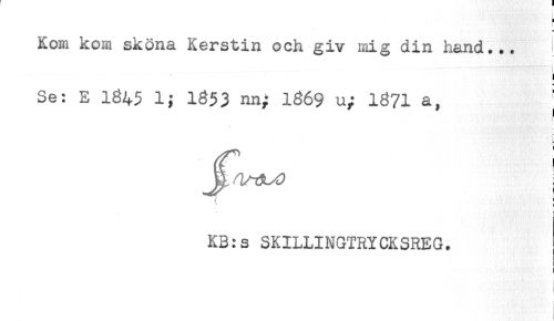 //// t //// < //// Kom kom sköna Kerstin och giv mig din hand... //// i //// Se: E 1845 1; 1353 nn; 1369 u; 1871 a, j //// * //// ^ ! //// KB:s SKILLINGTRYCKSREG. //// ! ////