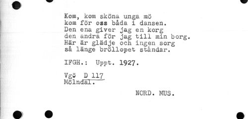 //// Kom, kom sköna unga mö //// kom för oss båda i dansen. //// Den ena giver jag en korg //// den andra för jag till min borg. //// Här är glädje och ingen sorg //// så länge bröllopet ståndar. //// IFGH.: Uppt. 1927. //// Vgö D 117 //// Mölndal?— //// NORD. MUS. ////