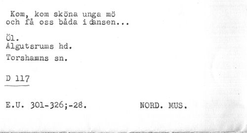 //// Kom, kom sköna unga mö //// och få oss båda icänsen... //// Öl. //// Algutsrums hd. //// Torshamns sn. //// D 117 //// E.U. 301-326;-28. NORD. MUS. ////