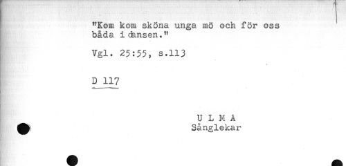 //// "Kom kom sköna unga mö och för oss ' //// båda icänsen." //// Vgl. 25:55, S.113 //// D 117 //// U LM A //// ; Sånglekar ////
